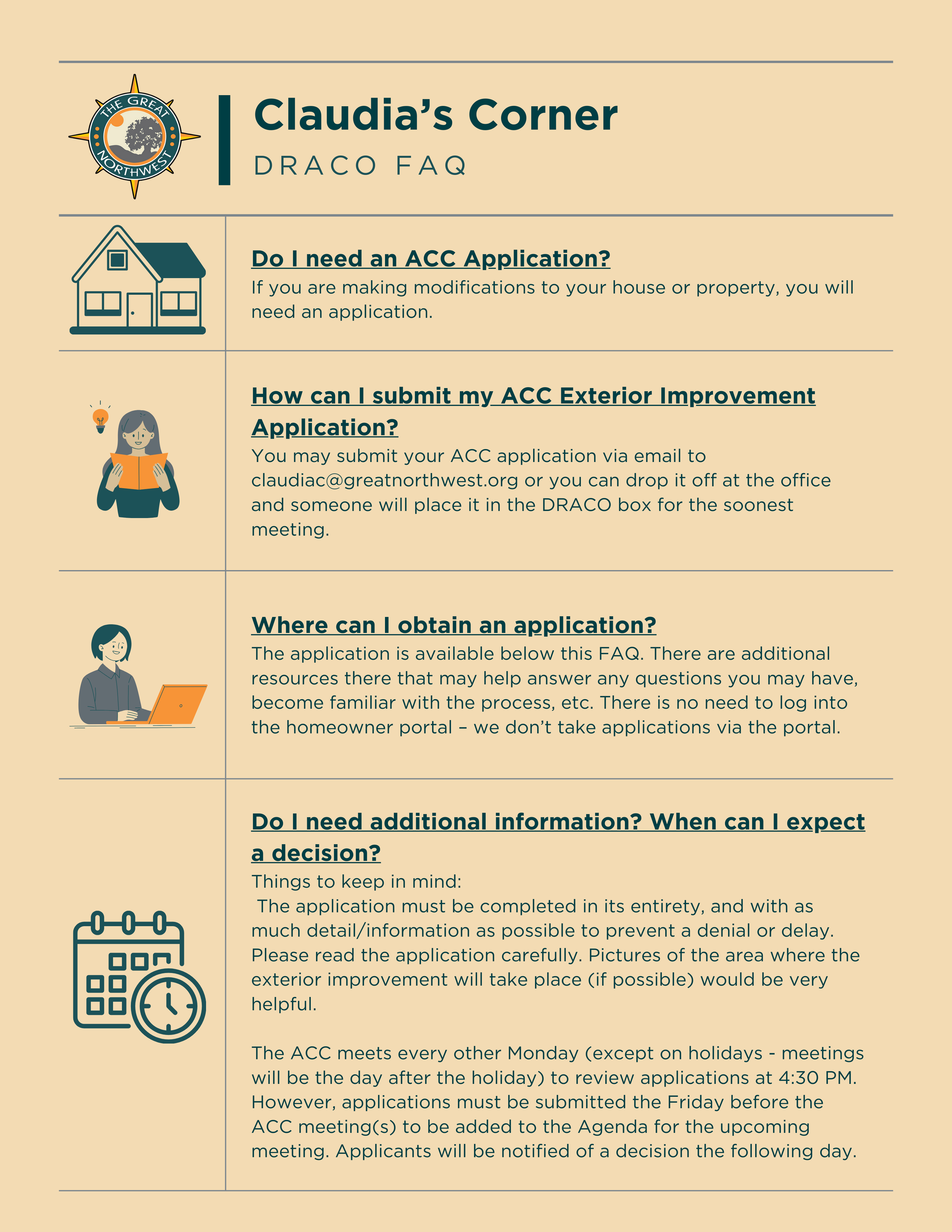 The Deed Restrictions and Architectural Control Department’s job is important and often tough. It is essential to the Community that Deed Restrictions and Architectural Control Officers enforce all rules in the Community with fairness and compassion. These core values promote a smooth-running Community Improvement Association, where members of the neighborhood know they are treated fairly, and equal to the rest of the Great Northwest Community members.
